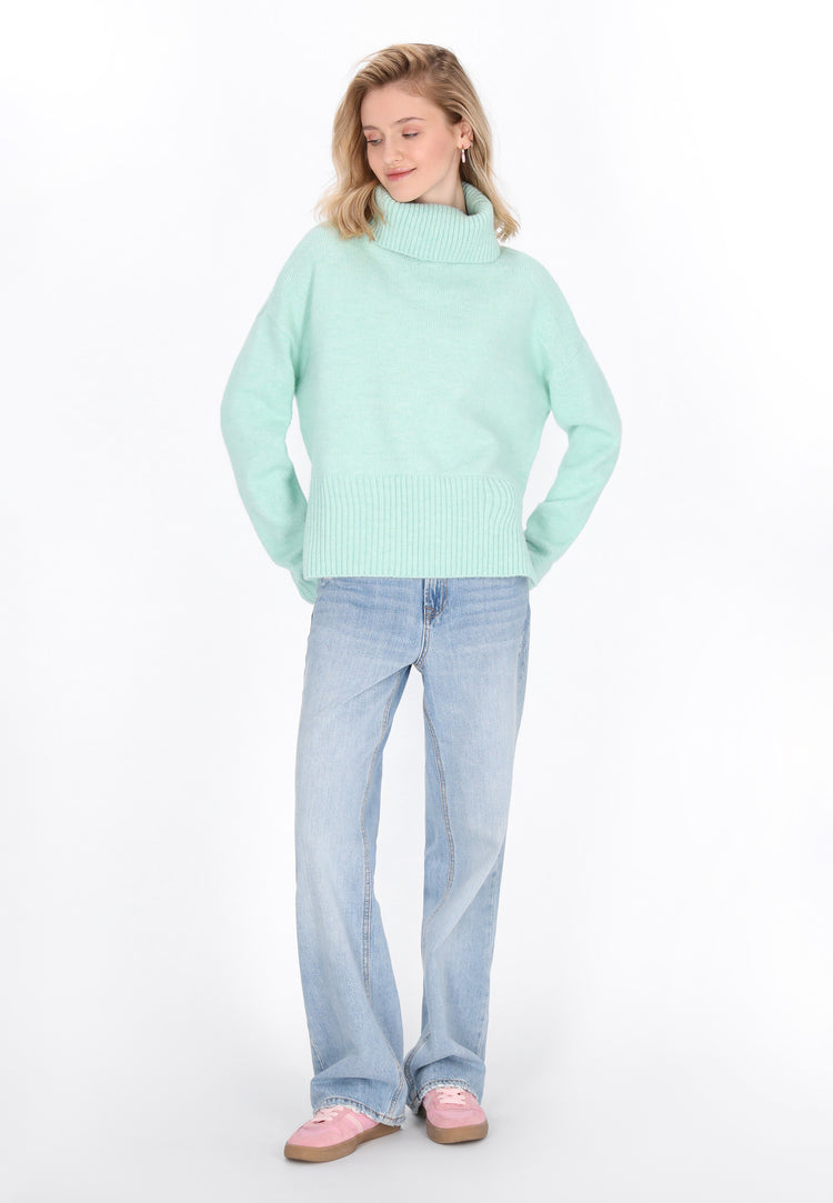 Enjoy the cozy charm of this knitted sweater from our Young Fashion Collection. The loose fit and dropped shoulders exude casual charm, while the high ribbed turtleneck provides warmth and comfort. Long sleeves with ribbed cuffs add a cozy and modern touch. Perfect for a comfortable yet stylish look.