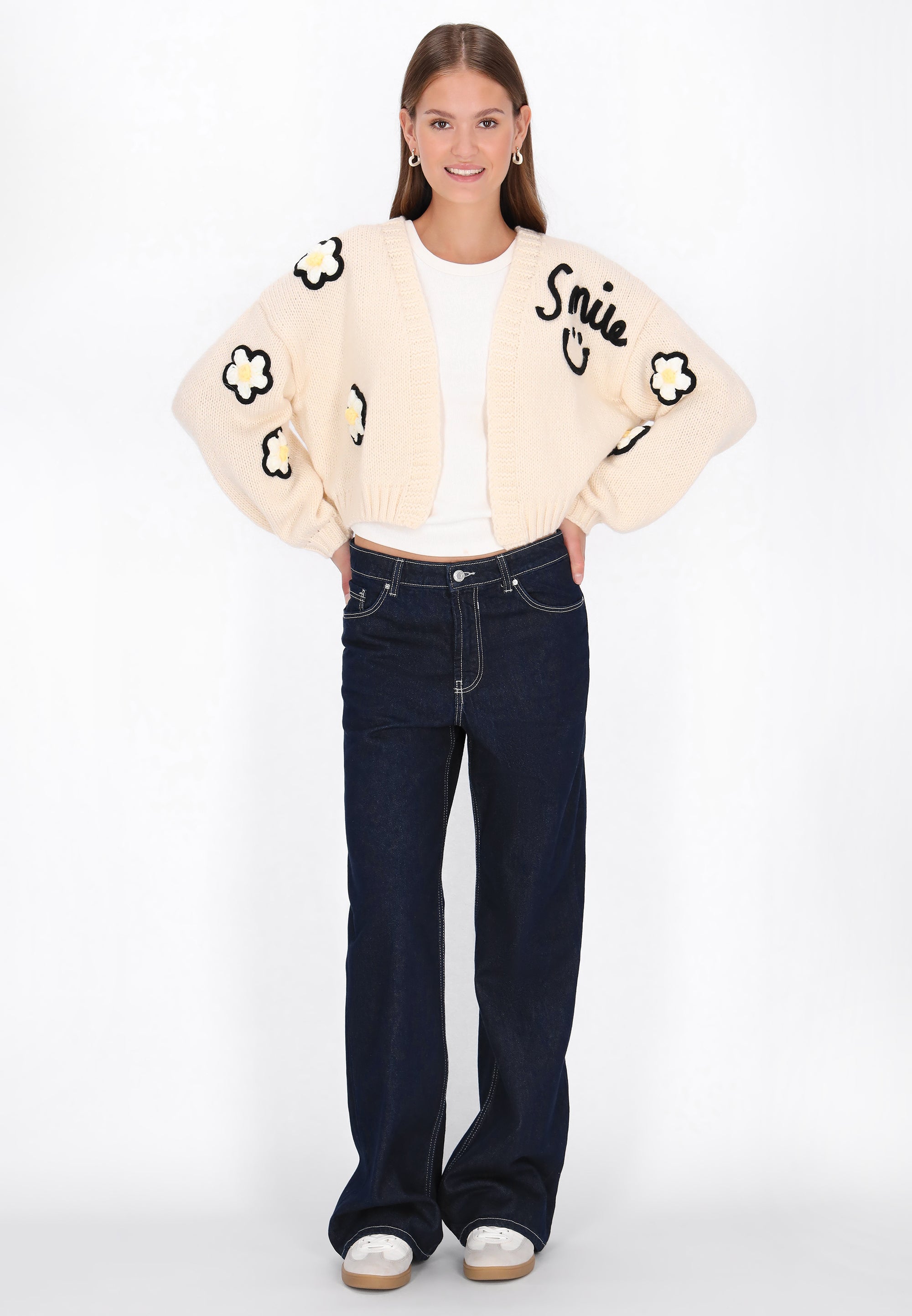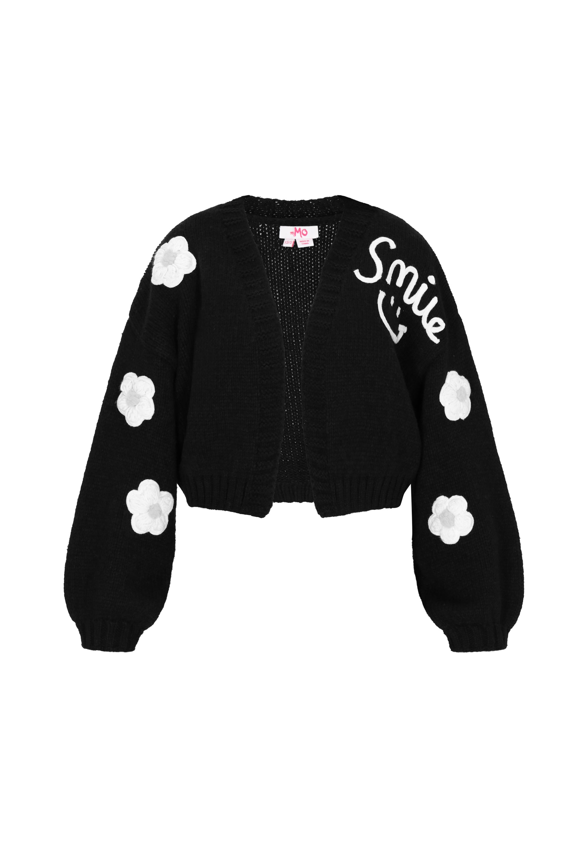 This charming, short cardigan from the Young Fashion Collection is the perfect choice for the back-to-school season, combining comfort, lightweight design, and girly style. Its loose fit, open front, long puff sleeves, and dropped shoulders ensure freedom of movement and comfort. A delicate, embroidered floral pattern adds a playful and fresh touch. Made of soft knit fabric, this cardigan is perfect for both school and everyday wear, emphasizing a youthful, charming look. Stylish, comfortable, and full of girly charm a must-have for cooler days.