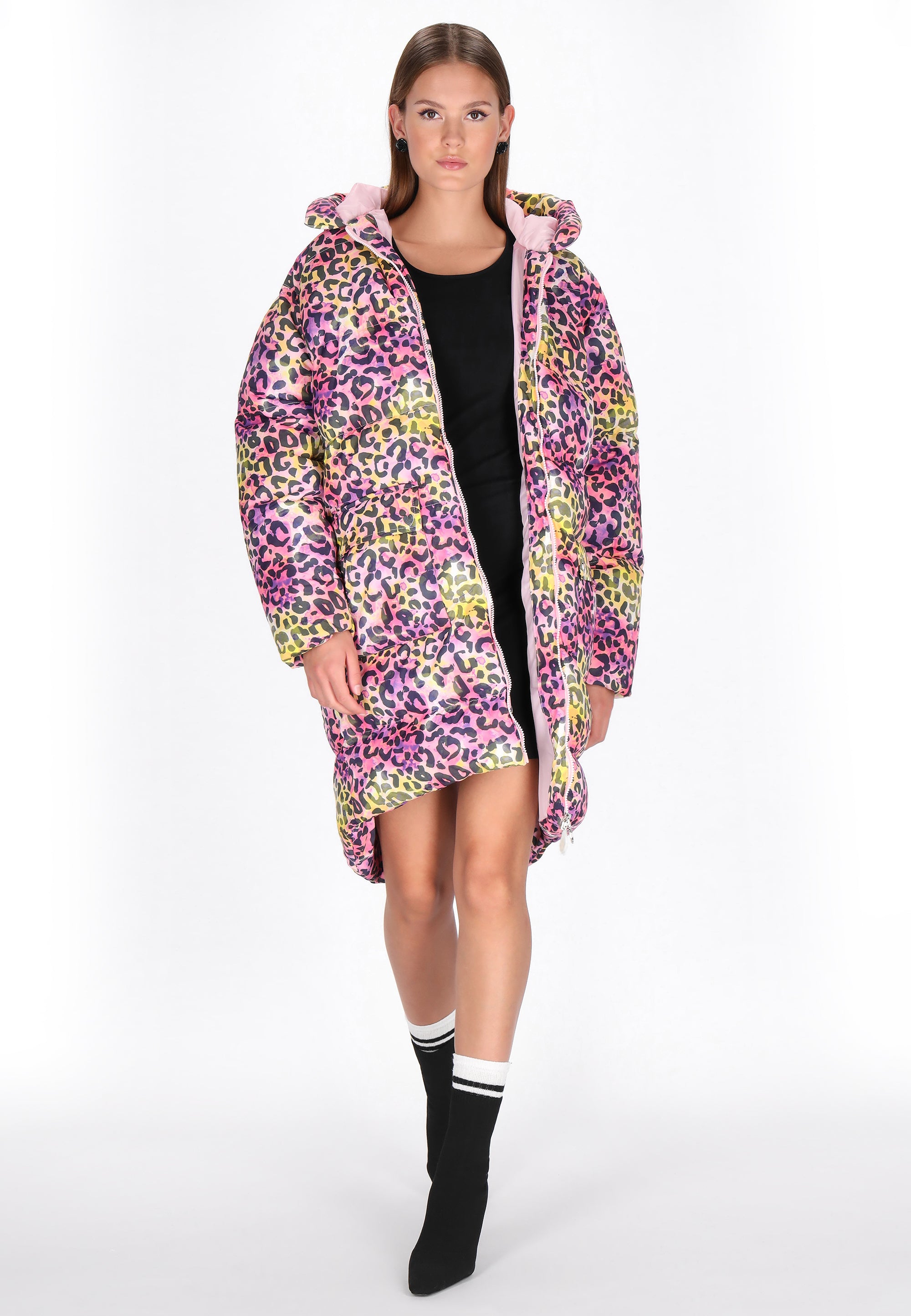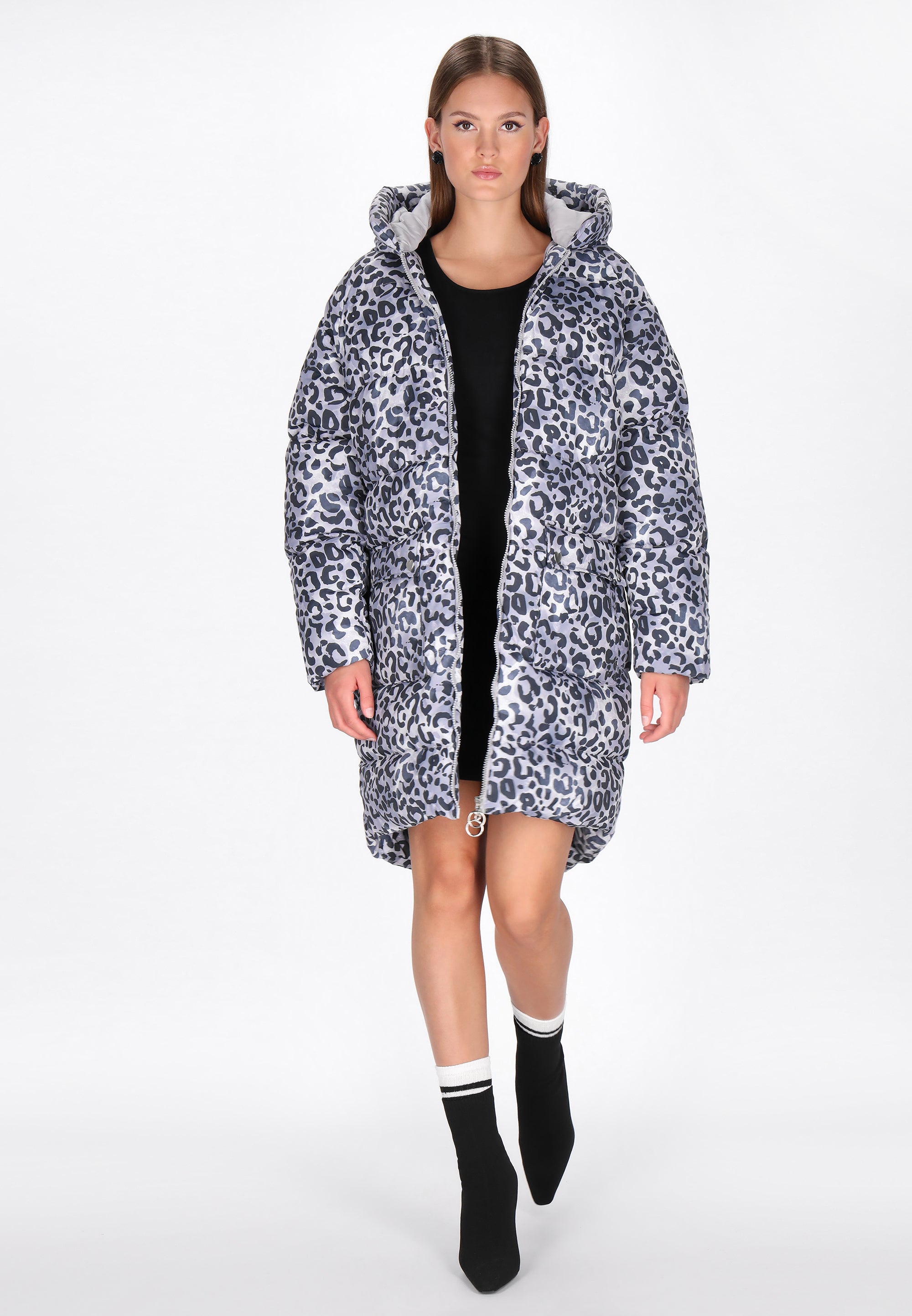 Introducing the down coat from the Mymo At Night Collection. This bold leopard print is the perfect blend of comfort, style, and functionality, designed for the modern, confident youth. The relaxed fit allows for freedom of movement, while the insulated construction and long length protect against the cold. A hood, long sleeves with elastic cuffs, and a zipper closure ensure maximum comfort and protection. Additional pockets enhance practicality, and the woven material adds a stylish touch. This is the perfect choice for chilly evenings and winter dayswhen you want to look stylish while feeling comfortable.