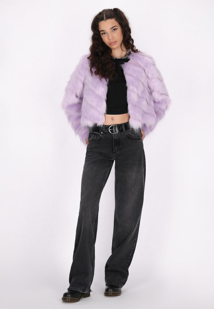 Indulge in the luxurious charm of this short jacket, which exudes pure opulence with its fluffy texture. The slim silhouette has a straight hem and a subtle round neckline, highlighted by a central fastening detail. With its sophisticated set-in sleeves and horizontal panels, this jacket offers an elegant yet cozy aesthetic that will elevate any outfit.