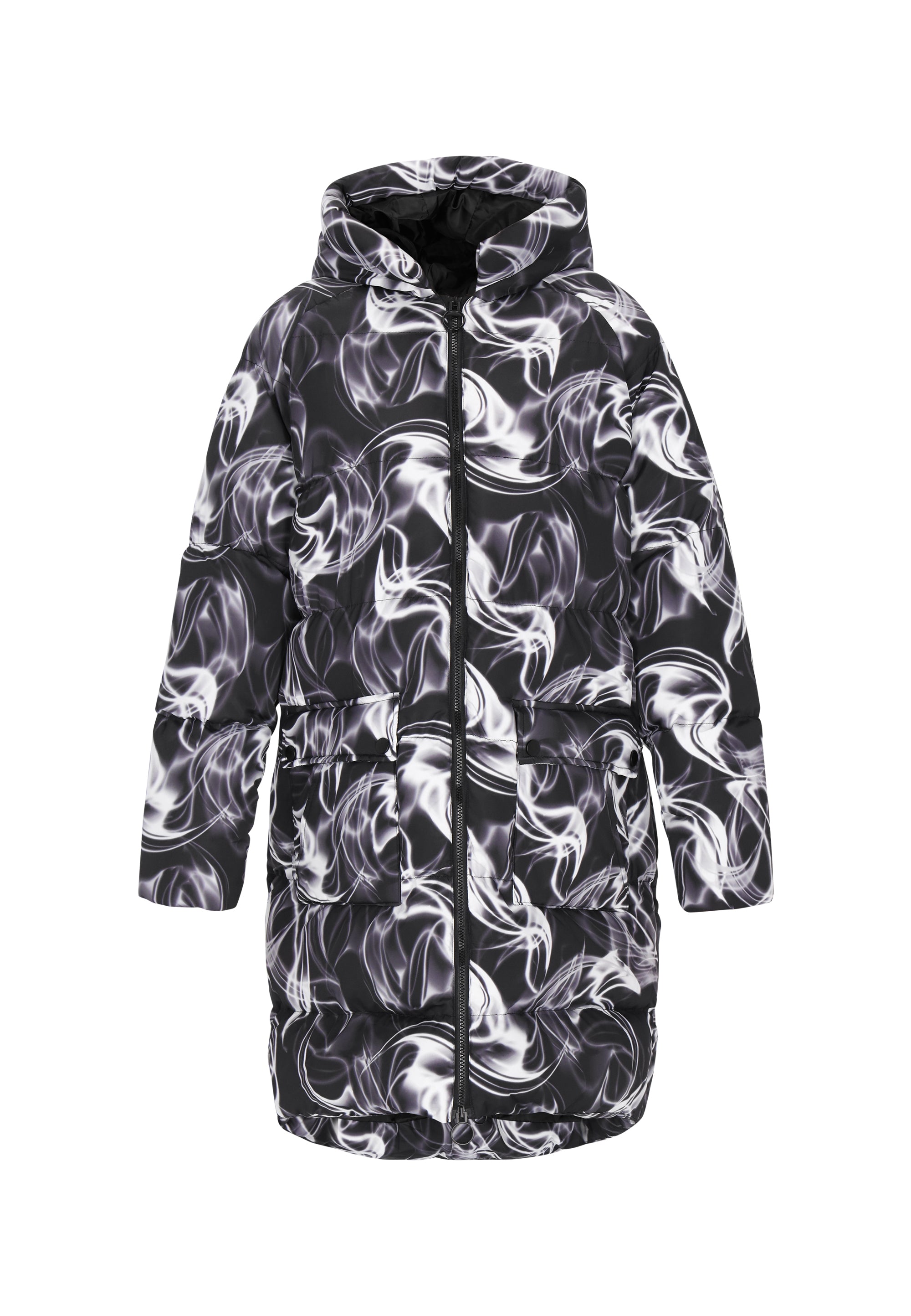 Keyword: abstract print, coat, comfy, flap pockets, hood, long sleeves, mymo athleisure collection, outerwear, puffer coat, relaxed fit, woven, young fashion, zip-up
